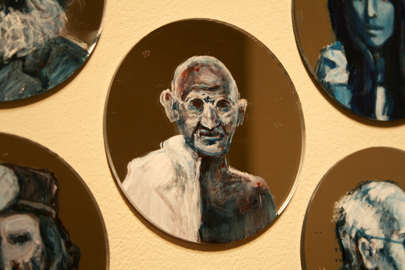Detail: Mohandas Gandhi, Jewel Net of Indra installation, 1000 acrylic mirrors with 325 acrylic painted portraits, Aug. 2011 - present, photo: Gareth Bate. Return to Installation | Artist Statement and List of Names | Press |