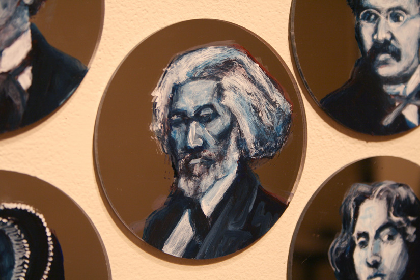 Detail: Fredrick Douglas, Jewel Net of Indra installation, 1000 acrylic mirrors with 325 acrylic painted portraits, Aug. 2011 - present, photo: Gareth Bate. Return to Installation | Artist Statement and List of Names | Press |