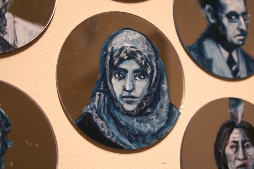 Detail: Tawakkul Karman, Jewel Net of Indra installation, 1000 acrylic mirrors with 325 acrylic painted portraits, Aug. 2011 - present, photo: Gareth Bate. Return to Installation | Artist Statement and List of Names | Press |