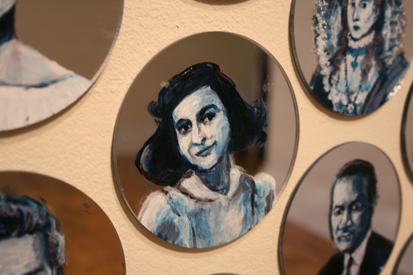 Detail: Anne Frank, Jewel Net of Indra installation, 1000 acrylic mirrors with 325 acrylic painted portraits, Aug. 2011 - present, photo: Gareth Bate. Return to Installation | Artist Statement and List of Names | Press |