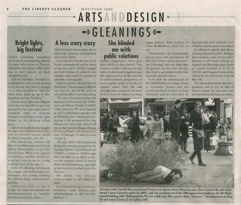 Toronto artist Gareth Bate performed Penance on Queen Street West last year. Bate recieved the 401 Richmond Career-Launcher prize for 2007, and was awarded the use of the 500-square-foot studio in the 401 Richmond building (401 Richmond St. W.) for a full year. His current show, "Lament," was launched on May 24 and runs to June 21 at Gallery 260.